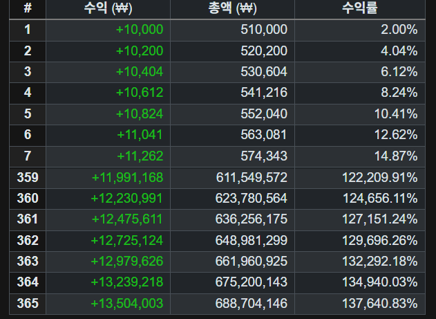 수익에도 수익이 붙는 복리이자 형식으로 1년이상 장기 프로젝트라고 생각하시면 되겠습니다.
